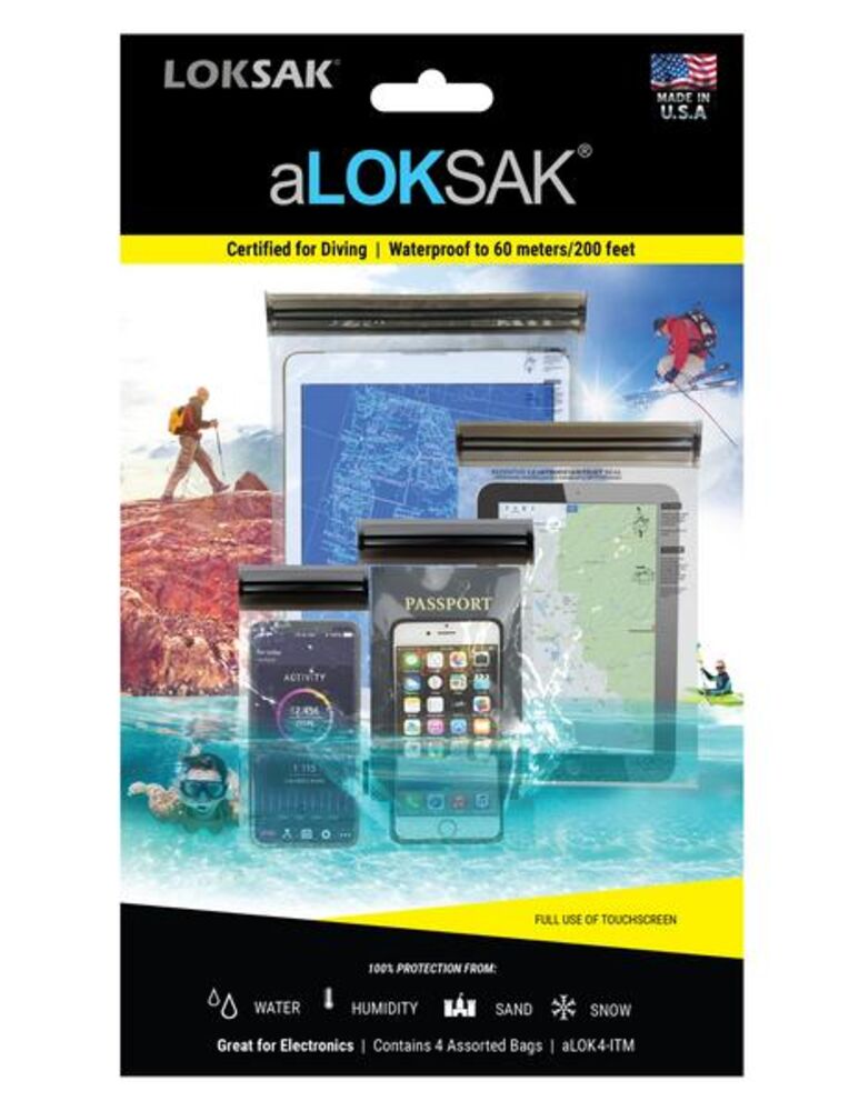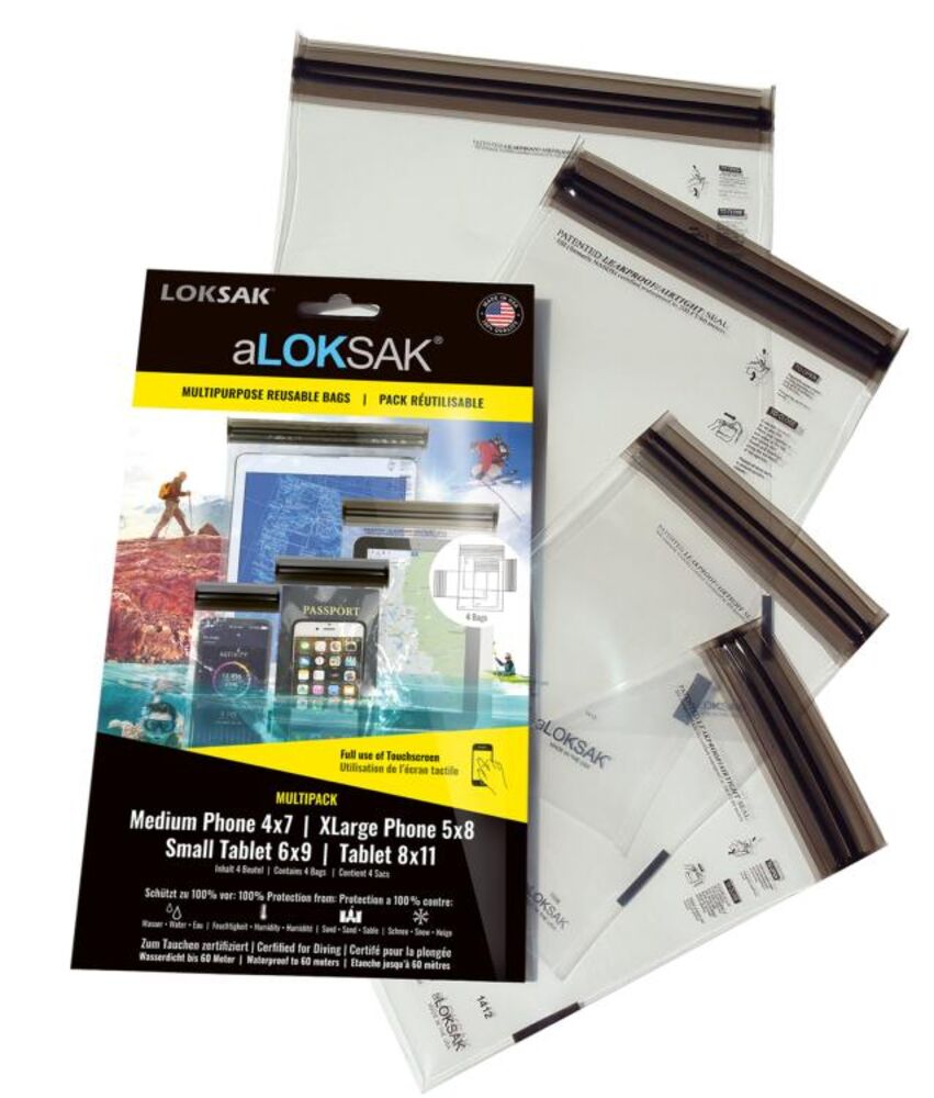 De aLOKSAK zakjes van LOKSAK zijn opbergzakken met een hermetische afsluiting. Dat betekent dat er absoluut geen water, lucht, stof of sneeuw de sluiting kan doordringen. Bovendien zijn de zakjes touchscreen-gevoelig en kan je ermee bellen en gebeld worden. Deze set bestaat uit vier zakjes van verschillende afmetingen: